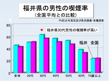 平成16年の県民及び国民健康栄養調査では、福井県男性の喫煙率と肥満度は、全国よりも高く、特にこれからの福井を担う30代での喫煙率が63.4%(全国男性57.3%)、BMI25以上の肥満者の割合が41.2%(全国男性28.9%)と突出しています。